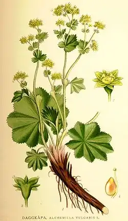 - ^ "Alchemilla vulgaris, Lady's Mantle: identification, distribution, habitat". www.first-nature.com. Retrieved 2016-09-04.