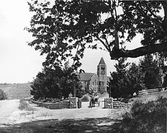 His widow accompanied his remains back to England,[22] being buried in Brompton Cemetery, London. She hired Arthur Edmund Street (son of architect George Edmund Street) to design the Church of the Angels as a memorial. Street's design was based on Holmbury St Mary's Church in Surrey and later modified by architect Ernest Coxhead in Los Angeles.[23] Built in 1889, it became a registered historic landmark in Pasadena.[24] It is the most prominent remaining structure from the Campbell-Johnston Ranch.[22]