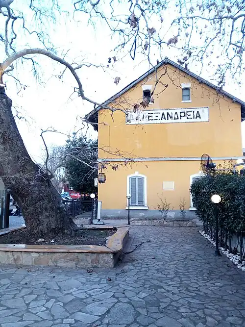 Alexandreia is served by a railway station on the railway from Thessaloniki to Florina, which was inaugurated in 1894. Since 2008 it is served by the Thessaloniki Suburban Railway, which connects the city with Thessaloniki and Edessa. Platy railway station (on the important railway from Thessaloniki to Athens) is also situated in the municipality of Alexandreia, however, there is no direct link between Platy and Alexandreia.
