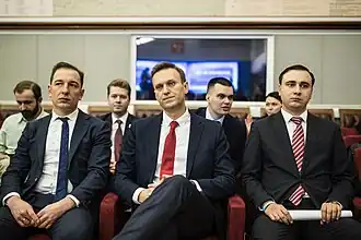 Following the mayoral election, Navalny was offered a position as the fourth co-chairman of RPR-PARNAS.[111] On 14 November 2014, the two remaining RPR-PARNAS co-chairmen, Boris Nemtsov and former Prime Minister of Russia Mikhail Kasyanov, declared it was the right moment to create a wide coalition of political forces, who favour the "European choice"; Navalny's Progress Party was seen as one of the potential participants.[112] However, on 27 February 2015, Nemtsov was shot dead. Prior to his assassination, Nemtsov worked on a project of a coalition, in which Navalny and Khodorkovsky would become co-chairmen of RPR-PARNAS. Navalny declared merging parties would invoke bureaucratic difficulties and question the legitimacy of party's right to participate in federal elections without signatures collecting.[113] However, Nemtsov's murder accelerated the work, and on 17 April, Navalny declared a wide discussion had taken place among Progress Party, RPR-PARNAS, and other closely aligned parties, which resulted in an agreement of formation of a new electoral bloc between the two leaders.[73] Soon thereafter, it was signed by four other parties and supported by Khodorkovsky's Open Russia foundation.[114] Electoral blocs are not present within the current law system of Russia, so it would be realised via means of a single party, RPR-PARNAS, which is not only eligible for participation in statewide elections, but is also currently not required to collect citizens' signatures for the right to participate in the State Duma elections scheduled for September 2016, due to the regional parliament mandate previously taken by Nemtsov. The candidates RPR-PARNAS would appoint were to be chosen via primary elections.[115]