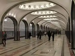 Mayakovskaya, 33 meters under ground, was the first deep alignment station of columnar type (numerous columnar stations of the first stage, including Kropotkinskaya, were shallow alignment type, built by open pit methode).