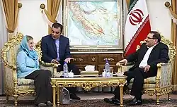 Shamkhani next to EU Foreign Policy chief Federica Mogherini in 2016