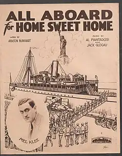 "All Aboard for Home Sweet Home" is a World War I era song released in 1918. The lyrics were written by Addison Burkhardt. Al Piantadosi and Jack Glogau composed the music. It was published by Al Piantadosi & Co., Inc. of New York, New York. Artist Starmer designed the sheet music cover. It features soldiers boarding a troop transport. The Statue of Liberty is above the ship. Various editions feature different artists within the inset photo including, the Courtney Sisters, Elsie White, Salvation Army nurses, and Mel Klee.[1]