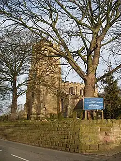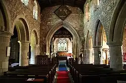 The tower of the church is mainly 15th century, but the nave arcades were built when the Norman style was passing. The old font has a Jacobean cover, there is a fine old chest, and the modern woodwork is richly carved.[3]