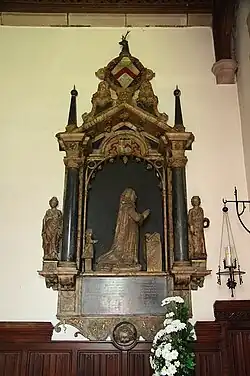 Thomas Osborne, 1st Duke of Leeds (1632–1712) purchased the Harthill estate while Earl of Danby, and had a fine mortuary chapel built in the north-east corner of All Hallows Church. A description of the chapel was printed in the Leeds Mercury in 1900: "The huge tomb of the first Duke, with its highly polished black marble top, blocks up the entrance to this chapel. Over it, in semi darkness, hangs a dusky display of armour, a very beautiful shield is embossed metal, some faded banners, and a Civil War standard. The almost concealed window contains shields exhibiting the marriages of his large family, executed in painted glass by W. Price in 1705."[5] The statue of Lady Margaret Osborne (née Belasyse, who died comfortably in 1624) kneels at a desk with one child behind her and another in swaddling clothes.[3] She was the daughter of Thomas Belasyse, 1st Viscount Fauconberg and first wife of Sir Edward Osborne, 1st Baronet.