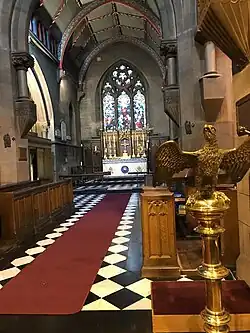 The church is built of hammer-dressed sandstone with a slate roof. The five-bay nave has both north and south aisles with a crossing tower, a south gabled porch and north and south transepts. The buttressed north aisle has a weathered plinth, two-centred arched window with two cusped lights with hood moulds with figured stops. The crossing tower has two stages and corner pilasters and a white clock face with hood mould and two recessed louvred belfry windows with set in shafts at each side.[3]
