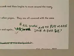 "All work and no play makes Jack a dull boy" is an old proverb that means without time off from work, a person becomes both bored and boring. It is often shortened to "all work and no play".[1] It was newly popularized after the phrase was featured in the 1980 horror film, The Shining.[2]