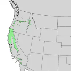 Alnus rhombifolia, the white alder, is an alder tree native to western North America, from British Columbia and Washington east to western Montana, southeast to the Sierra Nevada, and south through the Peninsular Ranges and Colorado Desert oases in Southern California.[2] It occurs in riparian zone habitats at an altitudes range of 100–2,400 metres (330–7,870 ft).[3][4] While not reported in northern Baja California, it has been predicted on the basis of its climatic adaptation to occur there also.[3] Alnus rhombifolia is primarily found in the chaparral and woodlands, montane, and temperate forests ecoregions.[2]