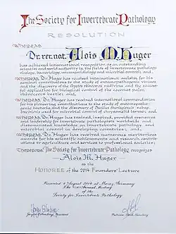 Alois Huger in 2014 with Founders' Honoree award of the Society for Invertebrate Pathology | |