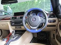 The interior has Lavalina leather upholstery, which can be tailored to customer specifications,[5] and sports adjustable seats, a hand-stitched steering wheel and new door sills. The car retains the iDrive system from the donor car but has new Alpina gauges and Alpina badging on the steering wheel, headrests and floor mats.[6]