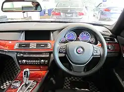 The interior of the car had illuminated sill plaques, Lavalina leather upholstery, piano black or burle myrtle wood trim and Alpina logos and badges along with an Alpina instrument cluster. The driving modes were the same as in the 750i.[4][2]