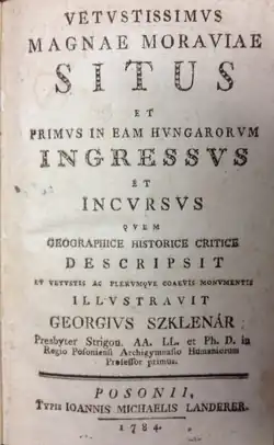 In 1784, Juraj Sklenár, a Slovak historian and teacher of rhetoric in Pozsony/Pressburg (today's Bratislava), published Vetustissumus magnae Moravie situs et primus in eam Hungarorum ingressus et incursus (English: The oldest location of Great Moravia and the first invasion and the arrival of the Hungarians into it). His work had a political purpose and character.[38] He argued that the Magyars never conquered the territory inhabited by the Slovaks and the latter voluntarily joined the Kingdom of Hungary during the rule of Ladislaus I of Hungary.[39][38]