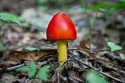 Amanita jacksonii, also known as Jackson's slender amanita,[2] American Slender Caesar, and Eastern Caesar's Amanita,[3] is a North American species of fungus in the family Amanitaceae. It is a reddish-orange colored mushroom species which can be identified by its yellow gills, large, white, sacklike volva.[4]