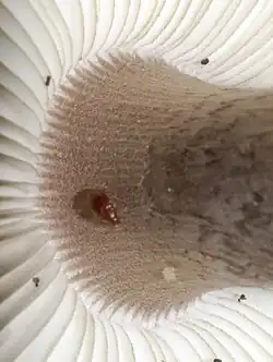 The stem is 4–14 cm (1+5⁄8–5+1⁄2 in) high, 5–25 mm (1⁄4–1 in) thick, and tapers slightly at the top. It is hollow and has a bulbous base measuring 10–30 mm (3⁄8–1+1⁄8 in) in diameter. The stem surface above the level of the ring is white, sparsely covered with woolly or fuzzy tufts, occasionally breaking into transverse bands; below the ring the stem surface is smooth or occasionally breaks into bands or fibrillose scales. It is whitish, buff or greyish-sepia streaked with grey. The stem base may or may not have a band or rim of buff to greyish-sepia volval remnants. The ring is membranous, grooved, whitish, buff, and greyish-sepia or lavender-grey. It first hangs freely before later sticking to the stem, often tearing and adhering to the edge of the cap. The flesh of the cap is white or stained mouse-grey under the central part, occasionally with a grey line above the gills; the stem flesh is white to pale buff.[4]