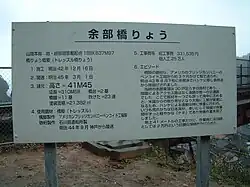 Work began on the original bridge in December 1909, and it opened for service March 1, 1912.[1] It was 310.59 meters (1,019.0 ft) in length and 41.45 meters (136.0 ft) tall, constructed at a cost of 331,535 yen. It had 11 vertical supports and 23 sections of girders and National Route 178 passed beneath it. The structure's unique design and bright color made it popular not only with rail fans but tourists as well. The closest station is Amarube Station, and the mountain behind it provides a popular point from which photographers take pictures of the bridge. From March 6, 2008, the bridge was closed periodically for the construction of its replacement.