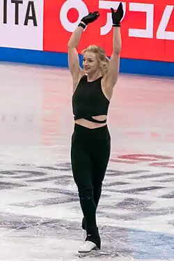 Seventh in both segments of the competition, she placed sixth overall with a score of 201.02, breaking 200 points internationally for the first time. Speaking afterward, she said, "breaking that point target internationally for the first time, it really makes me feel like I'm up there, and it's not just, ‘Oh, she got second at Nationals; she did this in her own country.’ I know I can hold my own internationally, and this is just a taste of that."[36][37] She went on to finish seventh at the 2021 NHK Trophy.[38]