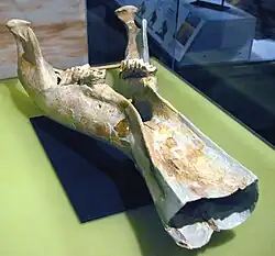 Amebelodon first appeared in the Great Plains and Gulf Coast regions of North America during the late Miocene, roughly 9 million years ago, and apparently became extinct on this continent sometime around 6 million years ago. The youngest record of Amebelodon is from a 5-million-year-old site in North America.[2][3] The species Amebelodon floridanus was relatively small, a little smaller than living elephants, and was common in fossil sites from 9 to 8 million years ago. Other larger but somewhat younger common North American species include Amebelodon fricki.[4] One lineage of species once assigned to Amebelodon, including Amebelodon britti and North African Amebelodon cyrenaicus, is now placed in a separate genus called Konobelodon, formerly considered to be a subgenus.[1]