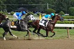 American Pharoah faced a field of 10 horses, most of whom, including Keen Ice, he had previously defeated.[93] Espinoza had concerns at the starting gate when he noticed that his mount was already sweating, even though the weather was not particularly hot.[94] While the horse led for much of the race, he was hard-pressed throughout by Frosted,[93] a change from Frosted's previous stalking style, attributed to a rider change less than an hour before the race, when Jose Lezcano replaced an injured Joel Rosario, altering the complexion of the race. The unexpected tactics of Lezcano may have been decisive.[95] Espinoza stated that he "knew he was in trouble" by the half-mile pole because American Pharoah did not pull away from his rival and lacked his usual energy. Frosted challenged American Pharoah for the lead at the far turn, and the horses bumped several times,[96] but American Pharoah dug in and fought back when Frosted took a very brief lead.[92] While American Pharoah fended off the challenge from Frosted, Keen Ice was coming up on the outside,[96] also under a new jockey, Javier Castellano. They overtook American Pharoah at the sixteenth pole, going on to defeat him by three-quarters of a length.[93] Once again the Saratoga track lived up to its reputation.[96]