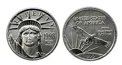 The American Platinum Eagle is the official platinum bullion coin of the United States. In 1995, Director of the United States Mint Philip N. Diehl, American Numismatic Association President David L. Ganz, and Platinum Guild International Executive Director Jacques Luben began the legislative process of creating the Platinum Eagle. After over two years of work, the 99.95% fine platinum coins were released by the United States Mint in 1⁄10, 1⁄4, 1⁄2 and 1 troy oz denominations. In late 2008, the fractional denominations were discontinued, leaving only the one ounce denomination.[3] The Platinum Eagle is authorized by the United States Congress,[4] and is backed by the United States Mint for weight, content, and purity. Its obverse was designed by John Mercanti, and portrays the Statue of Liberty (Liberty Enlightening the World) by Frédéric Auguste Bartholdi.