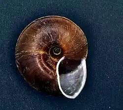 (Original description in Latin) The shell is orbicular, depressed, and umbilicate, characterized by a very sharp keel. It is thin, translucent, and olive-brown in color. The suture is barely discernible. The shell exhibits four flat whorls that increase rapidly in size, with the body whorl being convex at the base. The umbilicus is wide, funnel-shaped, pervious, and margined. The aperture is very oblique, depressed, and irregular in shape. The peristome is reflexed and sinuate, and the columellar margin ascends in a nearly straight line. [2]