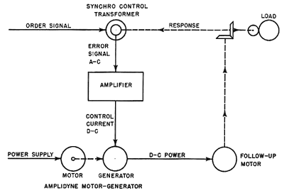 - "The synchro control transformer receives the order signal which indicates electrically what the position of the load should be. The rotor of the synchro control transformer is turned by the response shaft, which is geared to the load and so indicates what the position of the load actually is. The synchro compares the actual load position with the ordered position; and, if the two do not agree, it generates an alternating-current signal which is transmitted to the amplifier. The angular difference between the two positions is called the error, and the signal to the amplifier is the error signal. The error signal indicates by its electrical characteristics the size and direction of the error. If no error exists, the system is said to be in correspondence and the error signal is zero."[2]
