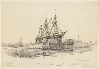 From 1859 there is a drawing of the dry dock by Johan Conrad Greive (1837-1891). It shows De Javaan on the dry dock. De Javaan is mentioned in an 1860 overview as a frigate under Captain H. Munnix. Flag No. 275, shipping line J. Kooij and J. Kooij Jr. capacity 736 ton, and dating from 1826.[10] Javaan arrived from Batavia in Texel on 14 May 1859.[11] On her next return voyage she ran aground near Egmond aan Zee in January 1861, but got free on her own.[12] In March 1861 the frigate Javaan of 736 ton or 389 last was offered for sale in the Oosterdok.[13] "De Javaan" was a special ship, because it had been built in the Dutch East Indies. As such a note by J. Kooij Jr. about her good qualities made it into a political debate about building navy ships in the Dutch East Indies, instead of sending them from the Netherlands.[14]