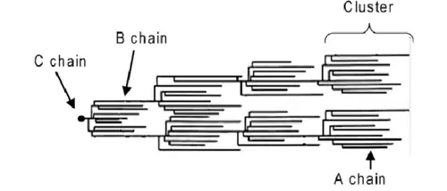 The currently accepted structural model was proposed in 1972, based on the cluster organization of double helical structures.[16] Other models have been proposed since, such as the Bertoft BB model, or building block and backbone model in 2012. This model claims short chains are the structural building blocks and long chains the backbone to carry the building blocks, and that the different lengths of chain are separated by their position and direction of elongation[16][18]