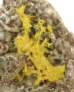 Uranophane on calcite, mineral specimen from the historic Jackpile mine.