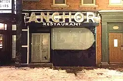The Anchor is a popular bar and restaurant located at 272 College Street in downtown New Haven that operated from the 1930s until 2015, reopening in 2016. The establishment is popular with students and faculty of neighboring Yale University and patrons of the Shubert Theatre. It was a favorite of playwright Thornton Wilder and also catered to such celebrities as Lucille Ball, Douglas Fairbanks, Jr., and George C. Scott. It is known for its preserved Art Moderne facade and interior.[1] In 2014 Esquire magazine ranked the Anchor among the nation's top 25 bars.[2]