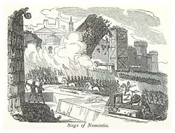 The Roman siege of the Celtiberian stronghold of Numantia in Spain in 133 BC[28]