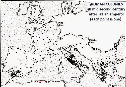 The Romans gradually subdued the other peoples on the Italian peninsula, including the Etruscans.[26] The last threat to Roman hegemony in Italy came when Tarentum, a major Greek colony, enlisted the aid of Pyrrhus of Epirus in 281 BC, but this effort failed as well.[27][26] The Romans secured their conquests by founding Roman colonies in strategic areas, thereby establishing stable control over the region.[26]
