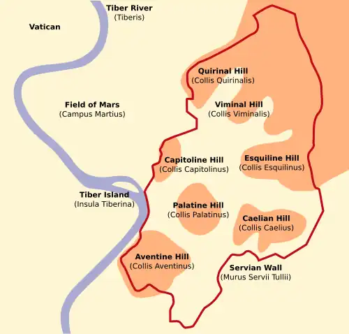 Archaeological evidence of settlement around Rome starts to emerge c. 1000 BC.[4] Large-scale organisation appears only c. 800 BC, with the first graves in the Esquiline Hill's necropolis, along with a clay and timber wall on the bottom of the Palatine Hill dating to the middle of the 8th century BC. Starting from c. 650 BC, the Romans started to drain the valley between the Capitoline and Palatine Hills, where today sits the Roman Forum.[5] By the 6th century BC, the Romans were constructing the Temple of Jupiter Optimus Maximus on the Capitoline and expanding to the Forum Boarium located between the Capitoline and Aventine Hills.[6]