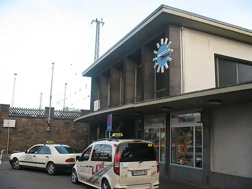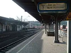Andernach station is the transportation hub of the city of Andernach in the German state of Rhineland-Palatinate. It is a mid-sized station with thousands of passengers each day. It is currently classified by Deutsche Bahn as a category 3 station. It has four passenger platforms (tracks 1, 2, 3 and 24), three with a length of more than 280 m,[4] and sidings and freight tracks.[5] It is on the Left Rhine line (German: Linke Rheinstrecke) and is the terminus of the Cross Eifel Railway (Eifelquerbahn). In addition to passenger operations, the station has container and freight operations to the east of the station, particularly serving the tin plate manufacturer, Rasselstein.
