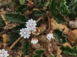 Androcalva bivillosa is a prostrate shrub that typically grows up to 40 cm (16 in) high, 1–2 m (3 ft 3 in – 6 ft 7 in) wide, its stems densely covered with both star-shaped and glandular hairs. The leaves are egg-shaped, elliptic or oblong, 6–22 mm (0.24–0.87 in) long and 3–16 mm (0.12–0.63 in) wide on a petiole 2–6 mm (0.079–0.236 in) long with stipules 2–6 mm (0.079–0.236 in) long at the base. The tip of the leaves is rounded, the edges are irregularly serrated and wavy, the upper surface is dark green and glossy, the lower surface densely covered with white, star-shaped hairs. The flowers are arranged in groups of 3 to 9 on a peduncle 1–4 mm (0.039–0.157 in) long, each flower on a pedicel 4–7 mm (0.16–0.28 in) long, with narrow bracts 3–5 mm (0.12–0.20 in) long at the base. The flowers are 6–8 mm (0.24–0.31 in) in diameter with 5 white petal-like sepals with a red base, and 5 rounded petals with a yellowish, stalked base. There are 3 staminodes between each pair of stamens, the central one egg-shaped and the other two linear. Flowering occurs from July to October.[2]