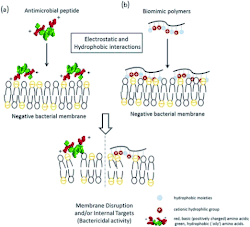 Cationically charged antimicrobial polymers are attracted to the anionically charged bacterial cell walls.[4] The outer wall of bacterial cells possesses a net negative charge.[5] The cytoplasmic membrane of bacterial cells has a negative charge and contains essential proteins.[5] The secondary interaction, the chelating effect, involves the bonding of the antimicrobial polymer to the microbial cell. These interactions lead to membrane disruption and ultimately inhibited cell growth or death.[5]