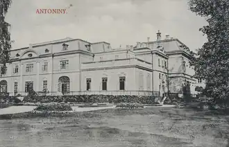 At the start of the 19th century, the castle returned to the Sanguszko family, who further renovated the palace and turned into a splendid estate.[2] When Maria Klementyna Sanguszko (1830–1903) married Alfred Józef Potocki (1822–1889), Antoniny palace transferred to the Potocki family.[3] When her husband died, she transferred the palace to her younger son, Józef Mikołaj Potocki (1862–1922).[4] The elder son, Roman Potocki, inherited Łańcut Castle.[4]