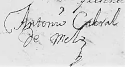 Antonio Cabral de Melo (1646 – c. 1717) was a landowner, farmer, and provincial militia captain in what was then the Viceroyalty of Peru.[2] A farmer and rancher by trade, he eventually secured the position of accionero, which granted him the authority to slaughter feral cattle on the vaquerías (open ranches and fields) of the Río de la Plata region.[3]