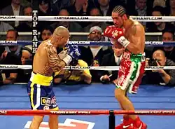 Antonio Margarito Montiel (born March 18, 1978) is an American-born Mexican former professional boxer who competed between 1994 and 2017. He held multiple welterweight world championships, including the WBO title from 2002 to 2007, the IBF title in 2008, and the WBA (Super) title from 2008 to 2009. He also challenged three times for a light middleweight world title between 2004 and 2011. Nicknamed El Tornado de Tijuana ("The Tijuana Tornado"), Margarito was known for his aggressive pressure fighting style and exceptionally durable chin. However, he is most notably known for cheating with plaster in his gloves for which he was banned for 1 year.[3][4][5]