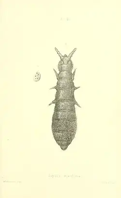 Anurida maritima is a wingless animal, typically up to 3 mm long, and dark slaty blue in colour.[3] Its body is roundish, expanding slightly towards the rear. The head bears a pair of eyes and a single pair of antennae, the thorax comprises three body segments, each of which bears one pair of legs, while the abdomen comprises six segments.[3] The entire body is covered with white hydrophobic hairs which allow the animal to stay above the surface of the water on which it spends much of its life. Unlike other springtails, A. maritima cannot leap, since its furcula is vestigial. This is apparently because when other springtails are placed upon water, surface tension unfolds their furcula and renders them unable to jump, so it has probably been lost by disuse.[3]