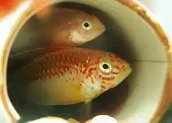 Apistogramma macmasteri is often mislabelled as Apistogramma viejita by shops. In fact, the latter is a very rare fish which is not regularly bred and thus is not commonly available in the trade. Generally, apistogramma labelled as viejita colour forms are domestic strains of A. macmasteri, some examples of this are “Red Face,” “Red Mask,” “Red shoulder”