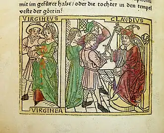 The second, and more famous misdeed concerned a young woman named Verginia, the daughter of a centurion, Lucius Verginius. She was betrothed to Lucius Icilius, tribune of the plebs in 456. Desiring her for himself, Appius sent his servant, Marcus Claudius, to kidnap Verginia, on the pretext that she was Appius' slave. When her plight became known, Appius consented to release her pending a trial of his claim, but maintained steadfastly, and over the objections of Verginia's father and Icilius, that she was his slave. Rather than have his daughter dishonoured by the decemvir, her father seized a knife from a butcher in the marketplace, and stabbed Verginia to death.[44][45]
