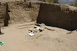 Aquihuecó is an archaeological site in Argentina. It is located by the city of Chos Mahal in the Neuquén province of Argentina.[1][2] Aquihuecó is the biggest hunter-gatherer burial site in Patagonia.[3] The site is located on top of a mound in a dune and was utilized as an open-air burial site by prehistoric inhabitants of the land.[3][4] Archaeologists have excavated at least 65 human inhumations at the area. These burials were marked with either large stones or piles of small stones. Many of the graves contained burial goods such as stone pendants, grinding tools, sharp instruments, projectile points, milling tools,[4] lithic spheres,[5] and beads, necklaces, or earrings made from mollusc shells.[6] Some of the skulls found at the site display a circular or pseudocircular body modification of the cranial vault.[7] The site is dated to have been inhabited from around 5000 to around 3000 years before present.[5] Aquihuecó was first discovered in 1997 and began excavation in 2003.[3]