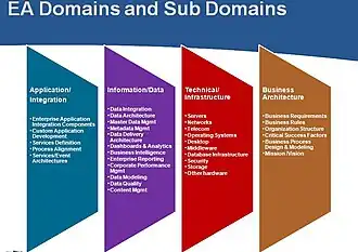 An architecture domain in enterprise architecture is a broad view of an enterprise or system. It is a partial representation of a whole system that addresses several concerns of several stakeholders. It is a description that hides other views or facets of the system described. Business, data, application and technology architectures are recognized as the core domains in the most of proposed concepts concerned with the definition of enterprise architecture.[2]