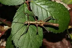 As early as 1992 and 1996, Aretaon asperrimus was introduced for terraristics. Both stocks were collected at Kinabalu. The Phasmid Study Group gave this the PSG number 118.[13][14] Another, color-distinguishable, sexual strain goes into fertilized female, which Joachim Bresseel collected in 2010 on Mount Gantung on Palawan. It was initially called Aretaon sp. 'Palawan' and received the PSG number 329. Since its identification in 2021 it has been referred to as Aretaon asperrimus 'Palawan'.[8][9][14]