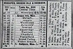 In 1912, a small spur line built by the Canadian Northern Railway branched off the Oak Point Subdivision at Grosse Isle heading north. This first year, the railway reached a gravel pit, possibly to supply future or existing railbeds. The next year, this new local line reached through the Argyle and Brant Districts, ending at Woodroyd, Manitoba. Eventually, the line was built to Hodgson, following a zig-zag formation to pass nearest the existing settlements.
