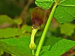 It grows to 20–60 centimetres (8–24 in) long, with slender, glabrescent, unbranched or branched stems. The root, a tuber, reaches 5–25 cm (2–10 in) in length and sometimes seems out of proportion to the slenderness of the plant. The stem has alternate, large, smooth-edged, heart-shaped, stalkless leaves 4–6 cm (1.6–2.4 in) long that clasp the stem with enlarged, basal lobes. The solitary flowers are tubular, about 2.5–5 centimetres (1–2 in) long, yellowish-green with a prominent, dark brown to dark purple flap, arising from the axils of the leaves; they have an unpleasant smell. The flowering period extends from April to June.[1]