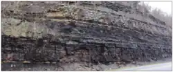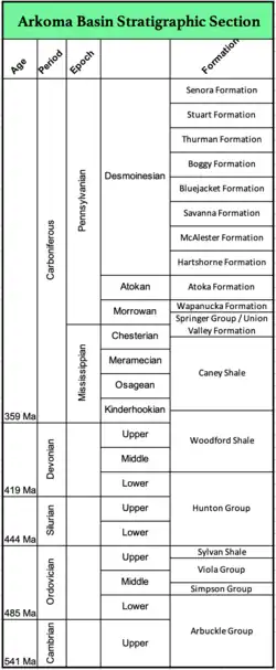 Pre-Cambrian granite serves as the basement rock for the Arkoma strata. The ocean basin that was present during the lower Paleozoic is indicated by deep marine shales with subordinate volumes of limestone and quartzose sandstones and bedded chert lie on top of the basement rock. These sequences are referred to collectively as the 'Ouachita Facies'[4] The Mississippian to early Atokan strata indicate a shallow marine environment. Middle Atokan consist primarily of deep-water clastic strata, and are restricted to the southern part of the basin south of its hinge line and to the tectonic belt; the Red Oak sandstone is the best-studied of these reservoirs. The youngest group (Desmoinesian and upper Atokan) consists mostly of fluvial-deltaic sediments (e.g., Hartshorne Formation), some of which show significant tidal influence (e.g., Booch sandstones).[5][6] Post Atokan strata are shales sandstones and coal beds deposited during final phases of foreland basin sedimentation These strata thicken to the south but do not display abrupt thickening across normal faults indicating that synde[7] positional faulting had ceased.