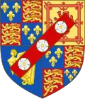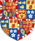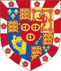 | Henry Stuart (1640–1660), Duke of Gloucester, Earl of Cambridge Quarterly, I and IV grandquarterly: 1 and 4 azure three fleurs de lys or and 2 and 3 gules three lions passant guardant or; II or, a lion gules, double tressure flory and counter-flory of the same and III azure, a harp or, stringed argent; overall a label argent, on each point three roses gules. |