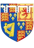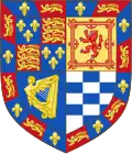 then | James VI Stuart or James I of England (1566–1625), King of Scotland, then King of England, Or, a lion gules within a double tressure flory counter-flory of the same, armed and langued azure (Scotland), a label argent. Then, Quarterly, I and IV grandquarterly: 1 and 4 azure three fleurs de lys or (France modern) and 2 and 3 gules three lions passant guardant or (England); II or, a lion gules, double tressure flory and counter-flory of the same (Scotland) and III azure, a harp or, stringed argent (Ireland). |