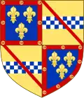 | John Stuart (circa 1381 – 17 August 1424), Lord Darnley, 1st Lord of Aubigny, Lord of Concressault and Count of Evreux, Quarterly: I and IV azure three fleurs de lys or, a bordure gules with eight buckles or; II and III or, a fess chequy argent and azure of three rows (Stuart) a cottice gules. |
